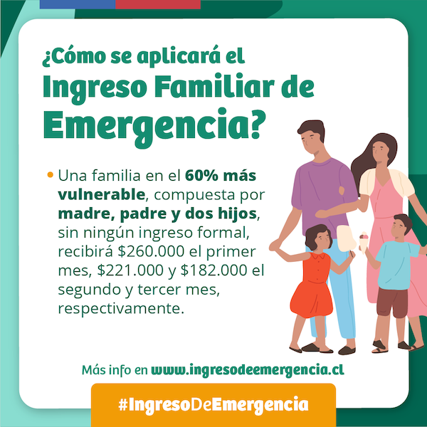El IFE es un subsidio directo al bolsillo de los beneficiarios, que se entregará a los hogares del 60% más vulnerable sin ingresos formales o que en el hogar viva un adulto mayor de 70 años o más que tenga Pensión Básica Solidaria. El beneficio se entregará por hasta tres meses y el monto dependerá del tamaño y del tipo de hogar.