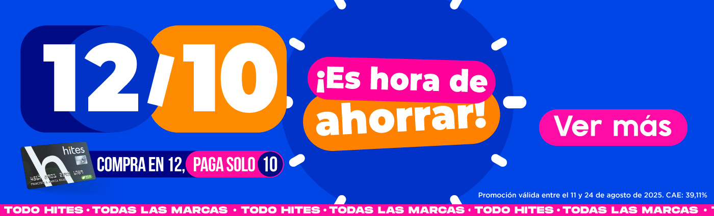 (5) Promoción válida para compras en 12 cuotas con Tarjeta Hites en tiendas Hites o en hites.com (incluye marketplace) 22 de octubre al 05 de noviembre. Para hacer efectivo el beneficio, el cliente debe haber pagado sin atrasos las diez primeras cuotas dentro de las fechas señaladas en su Estado de Cuenta. Las cuotas 11 y 12 serán saldadas en la cuenta Tarjeta Hites del cliente. La tasa de interés aplicada en la compra está debidamente publicada en nuestro sitio web y pizarras en tiendas. CAE 36,24% / tasa 2,91.